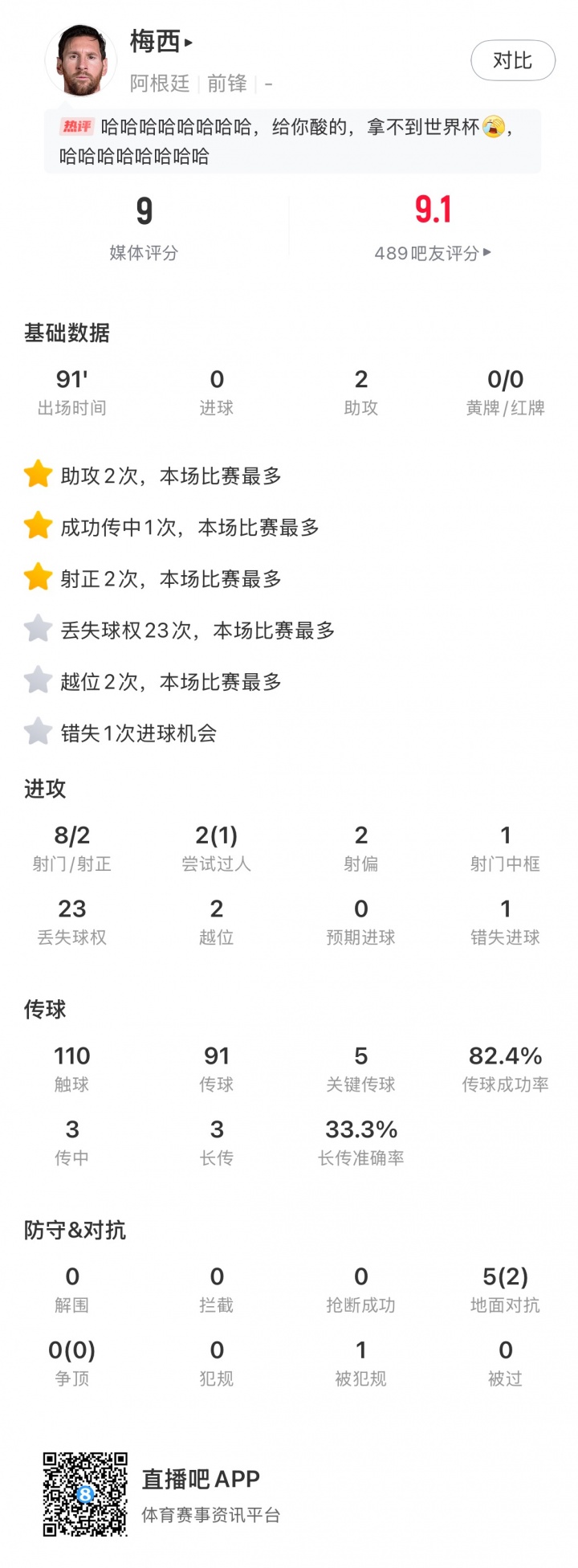 全场110次触球,91次传球,5次关键传球,5次对抗2次成功。