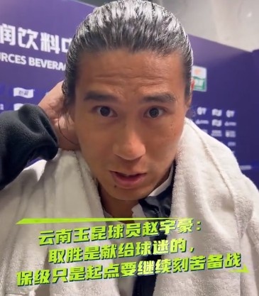 11月3日足球直播网讯 中超联赛第29轮,云南玉昆主场1-0击败青岛西海岸。在接受“云南广播电视台”采访时,玉昆球员赵宇豪谈到了自己的感受。
